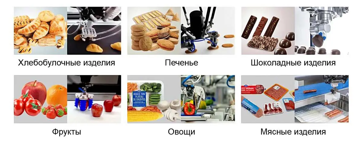 - Пищевая промышленность: упаковка и сортировка продуктов (печенье, конфеты, мясные изделия);