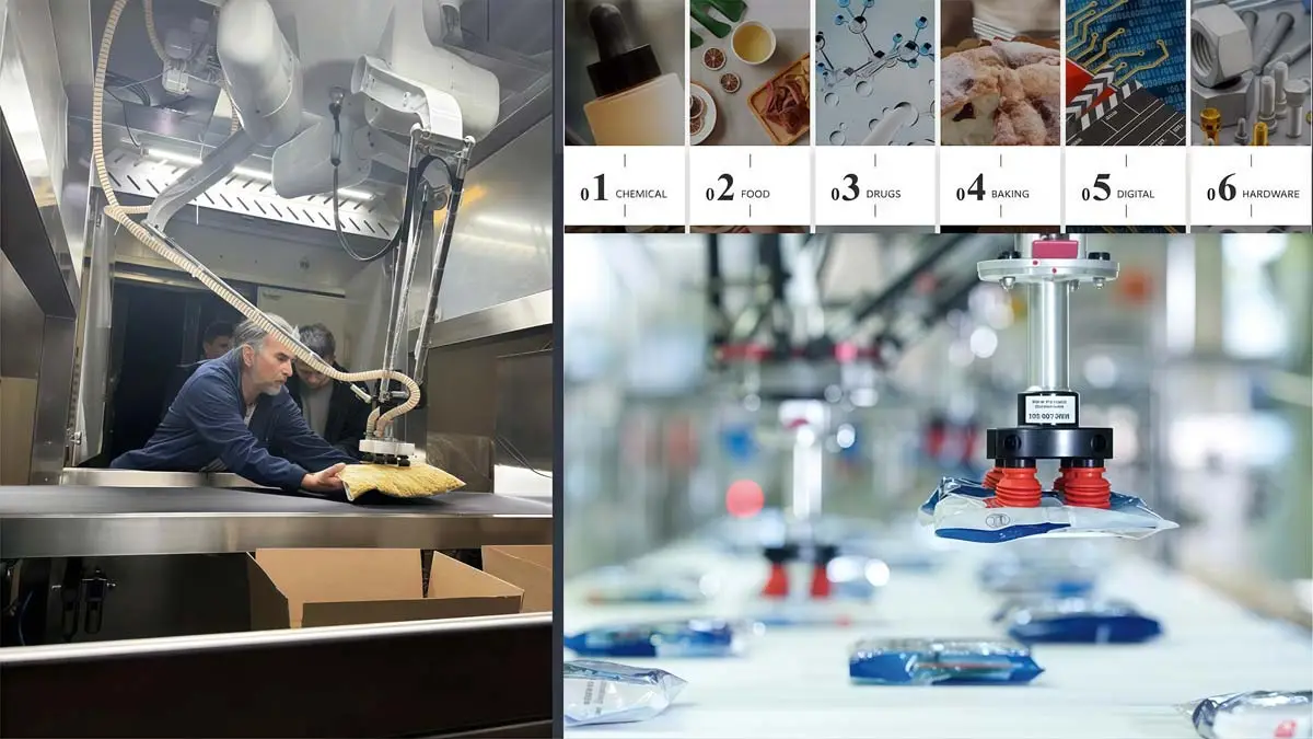 - Пищевая отрасль: укладка лотков с мясной продукцией, готовых блюд, фруктов, крупной выпечки;