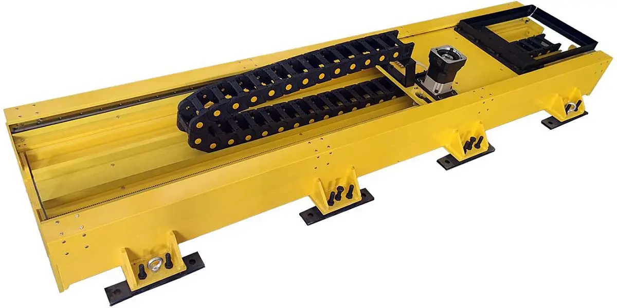 Трек оснащен надёжным приводом и системой точного позиционирования с повторяемостью до ±0.05 мм, что гарантирует стабильную работу даже в условиях интенсивной эксплуатации. Максимальная грузоподъёмность установки составляет 500 кг или 1000 кг, в зависимости от конфигурации и условий работы. Возможность остановки каретки в любом заданном положении обеспечивает гибкость при выполнении технологических операций.