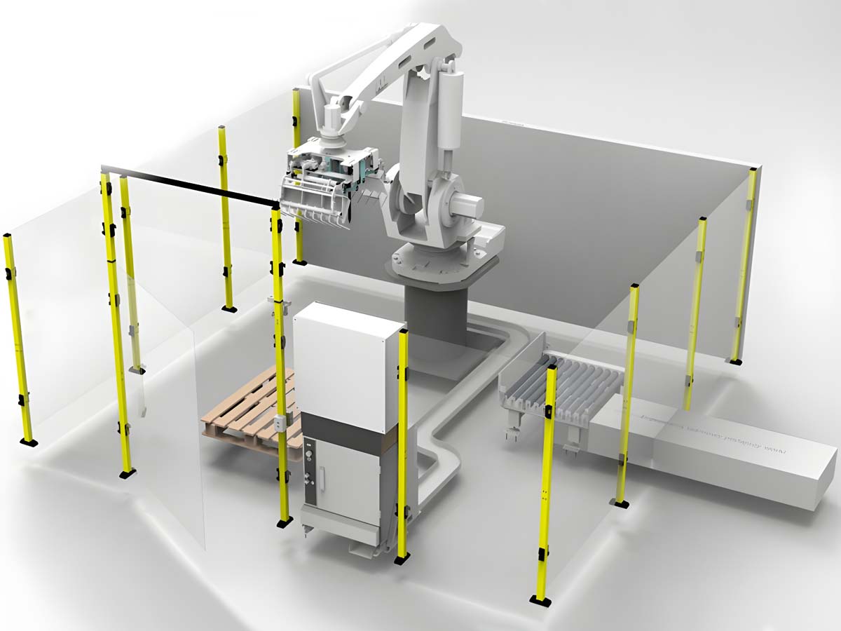 - Рольганговый конвейер: Оборудован функцией позиционирования продукции, что гарантирует точное размещение товаров перед захватом роботом.