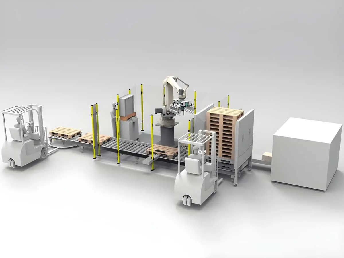 - Рольганг: Конвейер с функцией позиционирования продукции для точного размещения на поддоне.