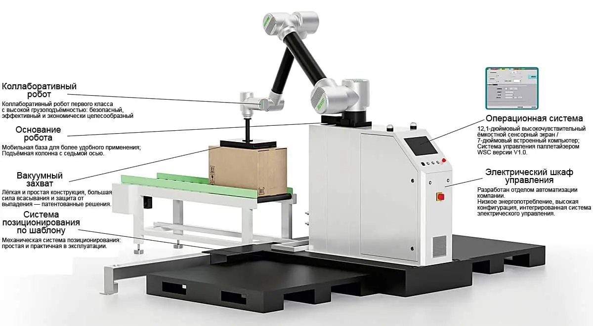 Основой устройства является коллаборативный робот с грузоподъёмностью до 40 кг, установленный на мобильной платформе с седьмой вертикальной осью. Это позволяет выполнять укладку в несколько уровней на паллете высотой до 2,1 метра и использовать сложные схемы укладки.