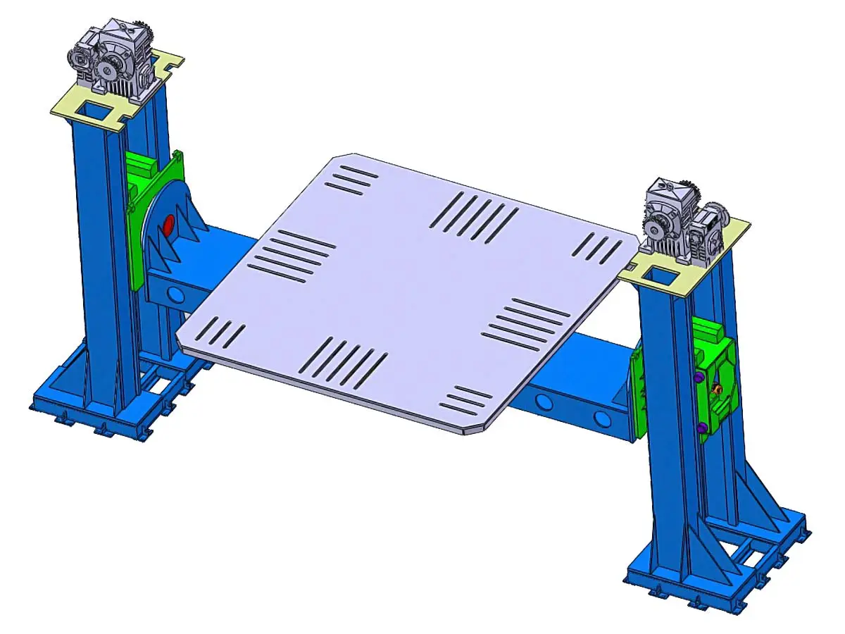 Конструкция позиционера выполнена в форме U-типа с двумя опорными колоннами и симметрично расположенной планшайбой. Такая архитектура обеспечивает не только механическую устойчивость, но и равномерное распределение нагрузки при вращении и наклоне, что особенно важно при работе с заготовками средней массы, до 300 кг. Основание выполнено из сварной углеродистой стали с последующей термической обработкой, что исключает деформации при длительной эксплуатации.