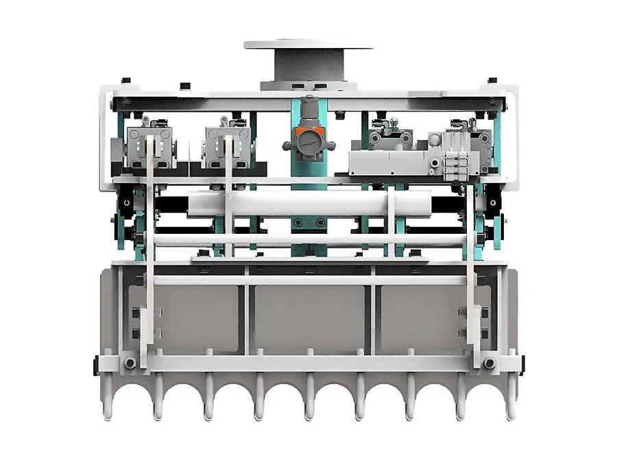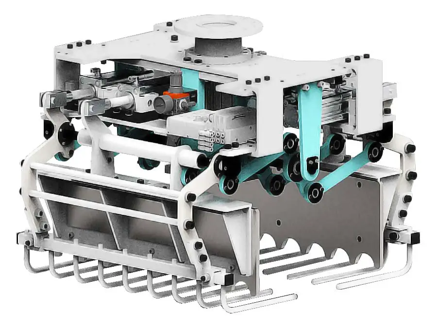 Клещевой захват GMX может быть оснащен дополнительными присосками для переноса прокладок между мешками, что повышает эффективность и универсальность его использования. Он работает в паре с рольгангом, обеспечивая слаженную работу в автоматизированных системах перемещения мешков.