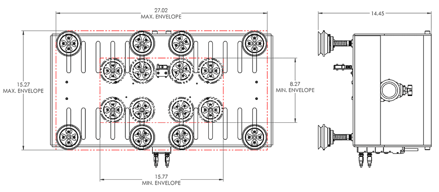 Регулировка позиций присосок: позиции вакуумных присосок можно настраивать в направлениях вперед-назад и влево-вправо, что обеспечивает гибкость при работе с объектами разных размеров и форм.