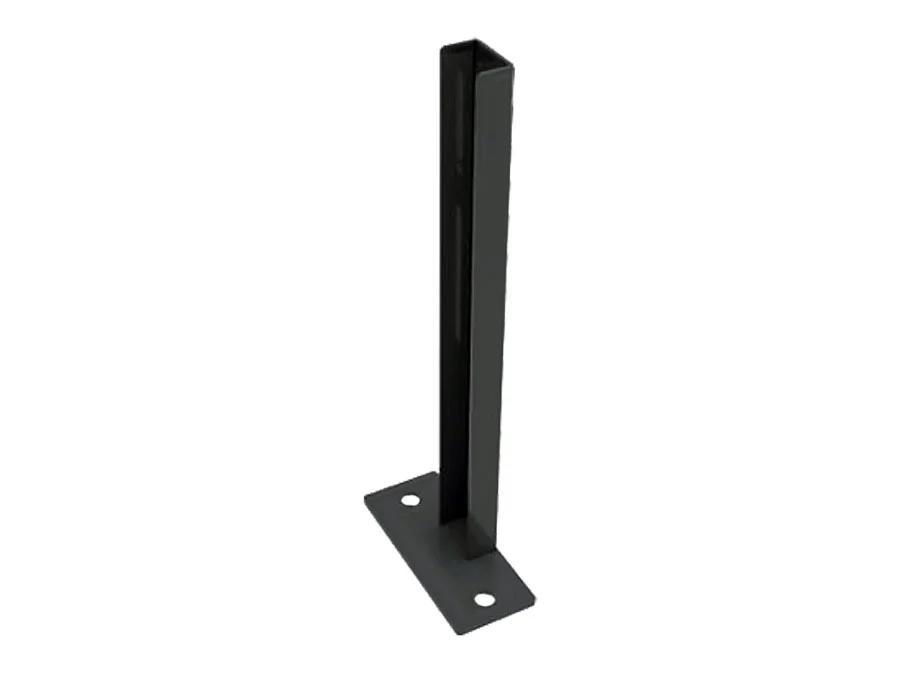 Опора представляет собой вертикальный П-образный или Г-образный профиль с основанием в виде перфорированной монтажной плиты. Нижняя пластина имеет два или более отверстий для анкерного крепления к полу, что обеспечивает устойчивость даже при динамических нагрузках.